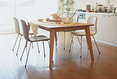 | フローリングには、木材保護オイルが 塗ってあり、木の良さを活かしています。 天井素材を使った、 木の呼吸を活かす塗料なので、 一歩部屋に入れば、 木の香りと湿気のないさらさら感があります。 |