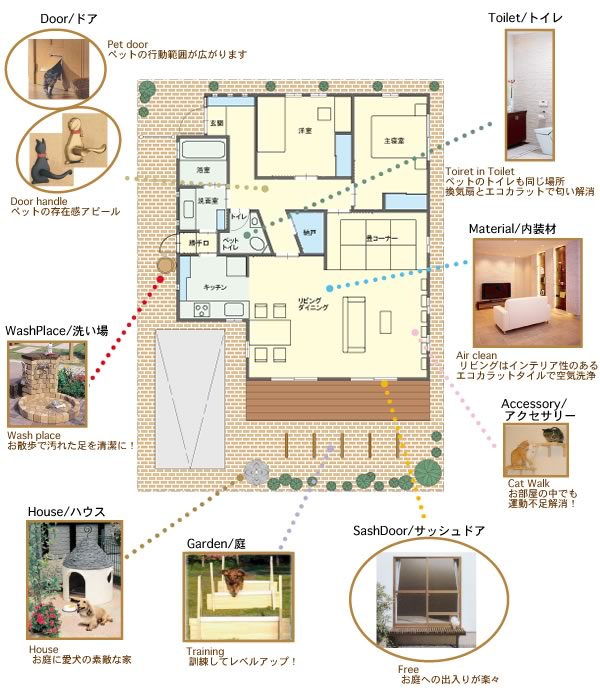 ペットと共に過ごす快適な生活空間をつくるためには、飼主さんとペットの、 程よい距離間、お互いの健康のための工夫など、住まいへの配慮がとても大切です。 私達は、ペットとの共生の為の「マテリアル・換気設備・インナーアクセサリー・アウトリビングプラン」をご提案します。